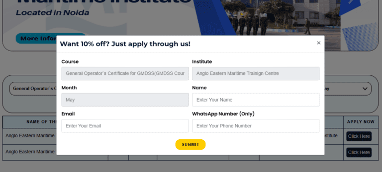 | Anglo Eastern Maritime Training Centre, Delhi | General Operator`s Certificate for GMDSS(GMDSS Course) - UK MCA Approved | N/A | Dates coming soon. Stay notified! |